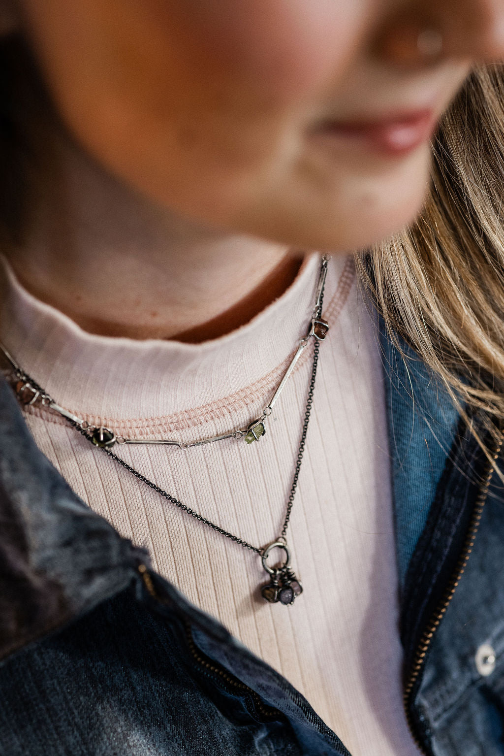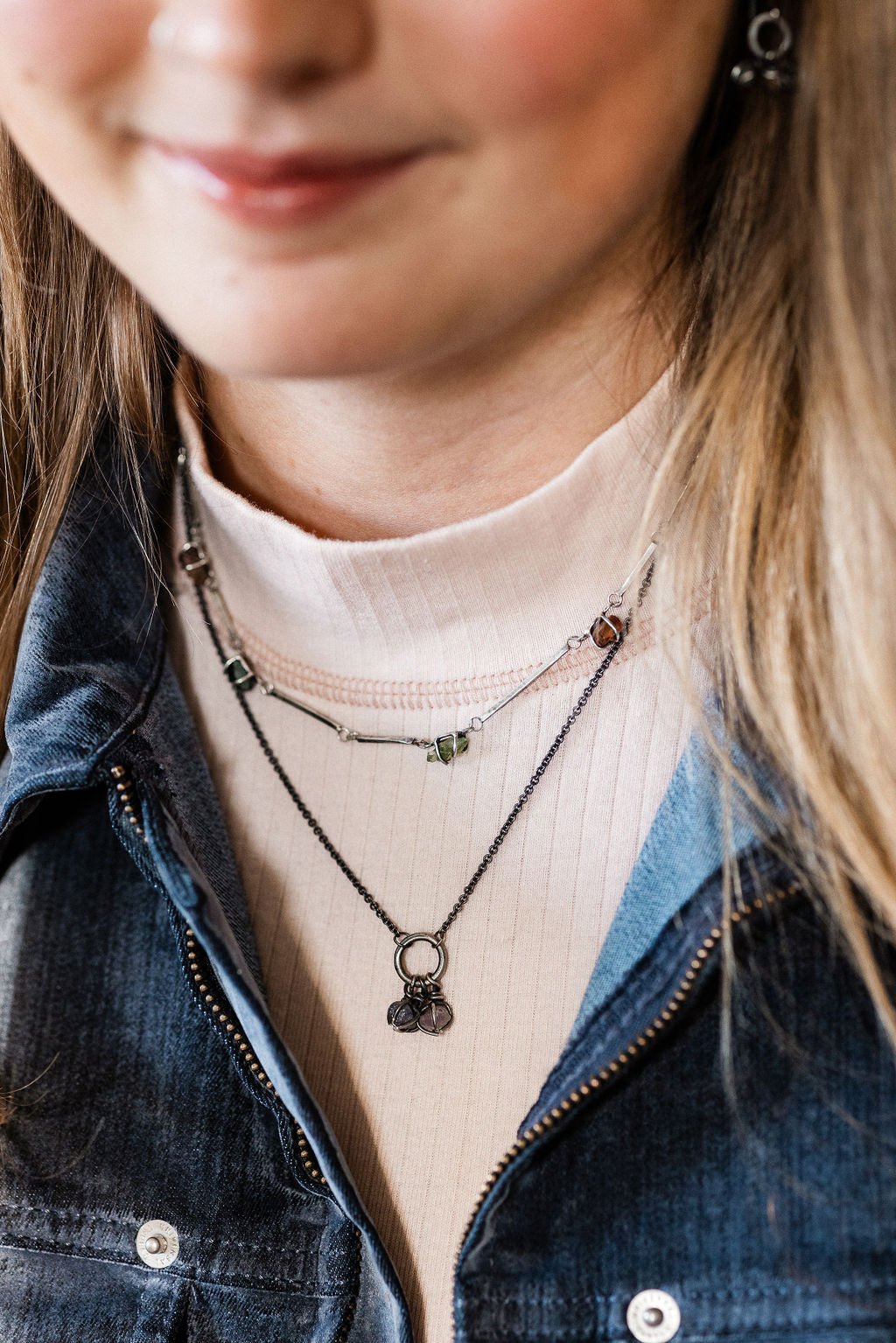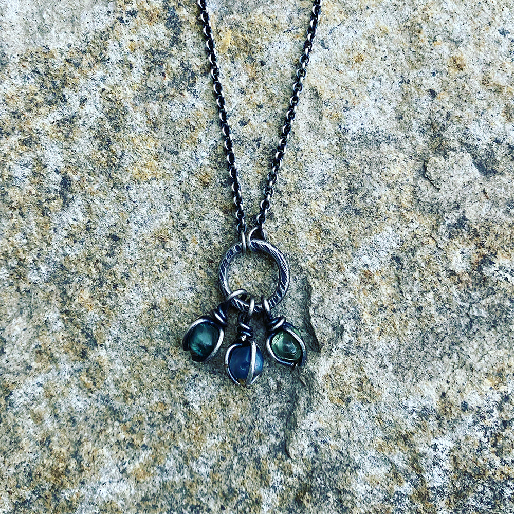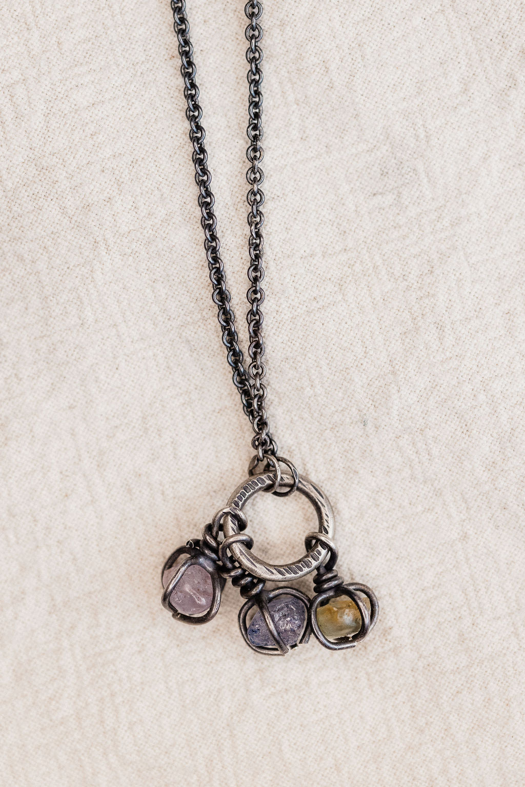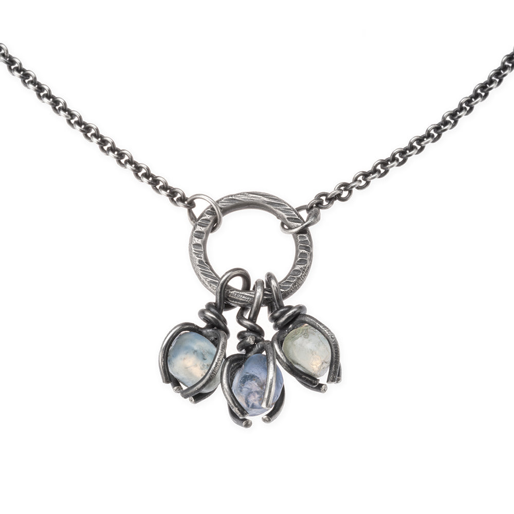 The Caroline Necklace has an easy, natural beauty that just feels right and comfortable and lovely. Three, rough Montana sapphires dangle from a small, silver ring. The necklace is 15 inches long, with a two inch extension. A different chain length may be requested. Hand-fabricated from recycled sterling silver and oxidized with a patina.