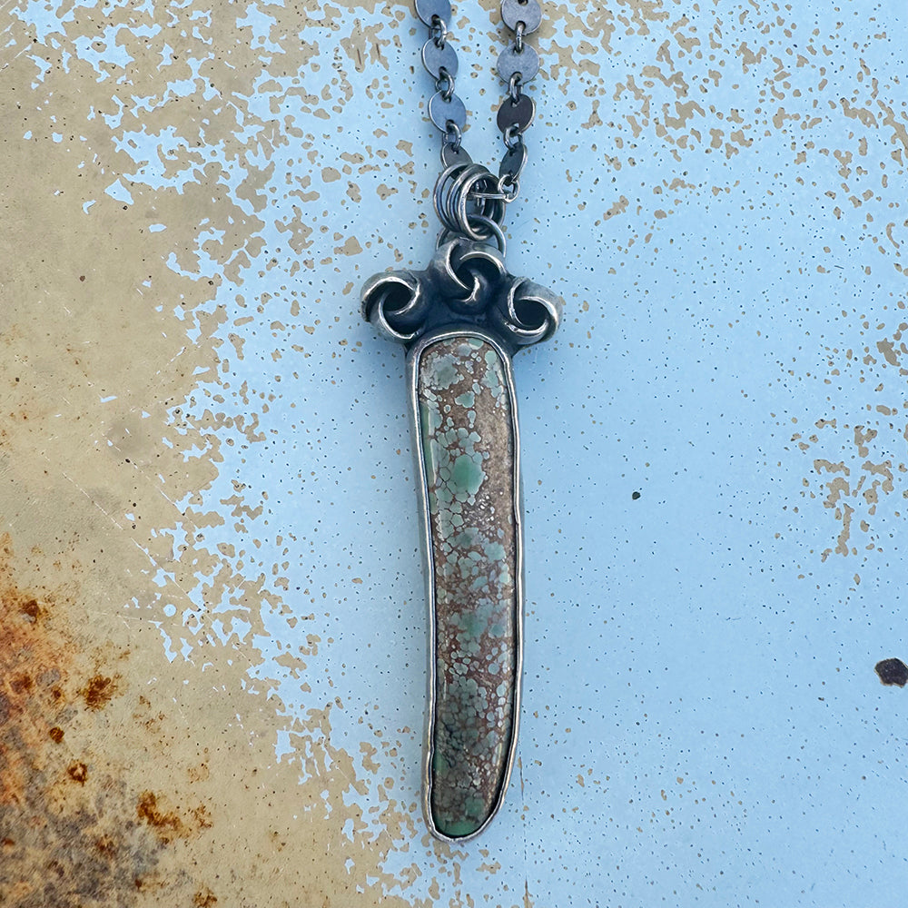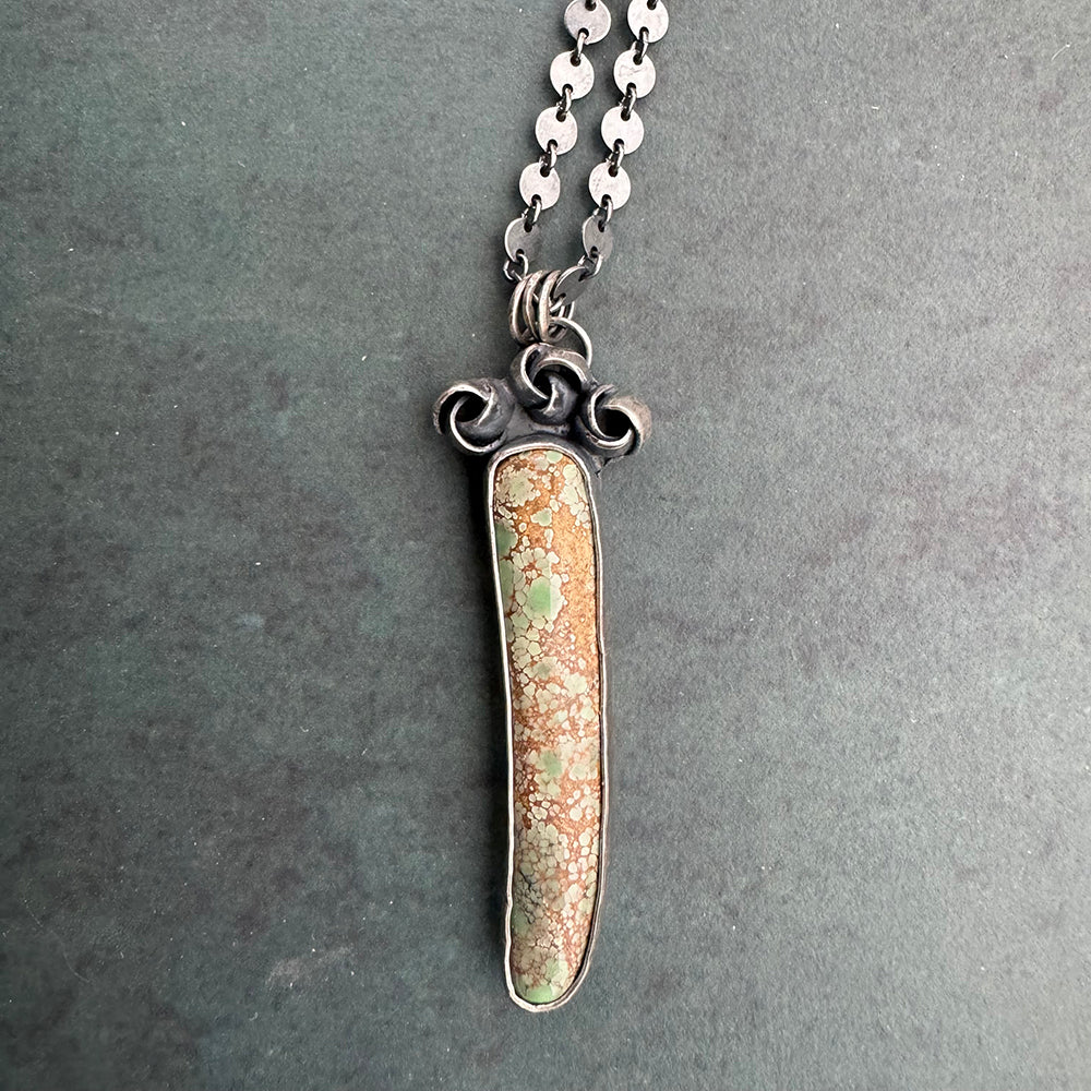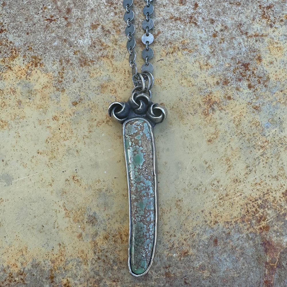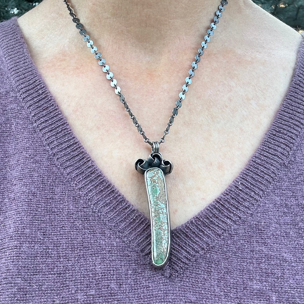 Exquisite turquoise sourced from.the Damale Mine in Nevada, cut into a long, graceful cabochon by a family lapidary. Embellished with hand-fabricated silver buds.