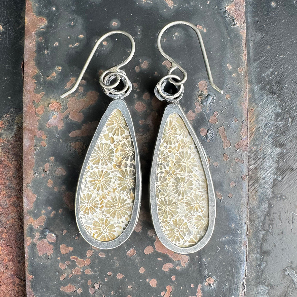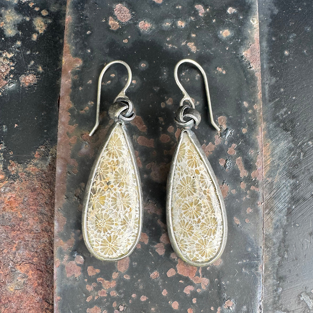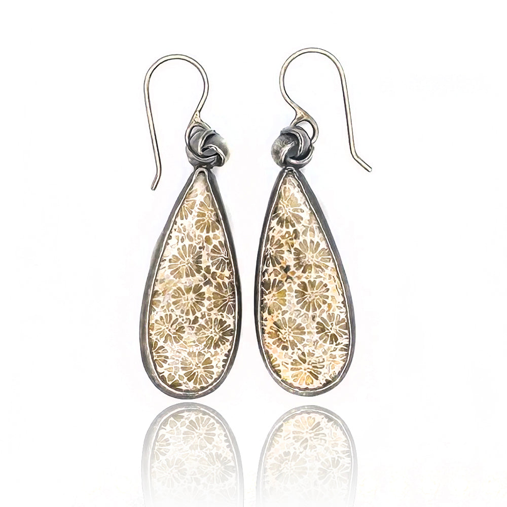 These two lovely specimens of agatized coral are held by hand-fabricated settings made from sterling silver and topped with my signature hand-made silver "buds".