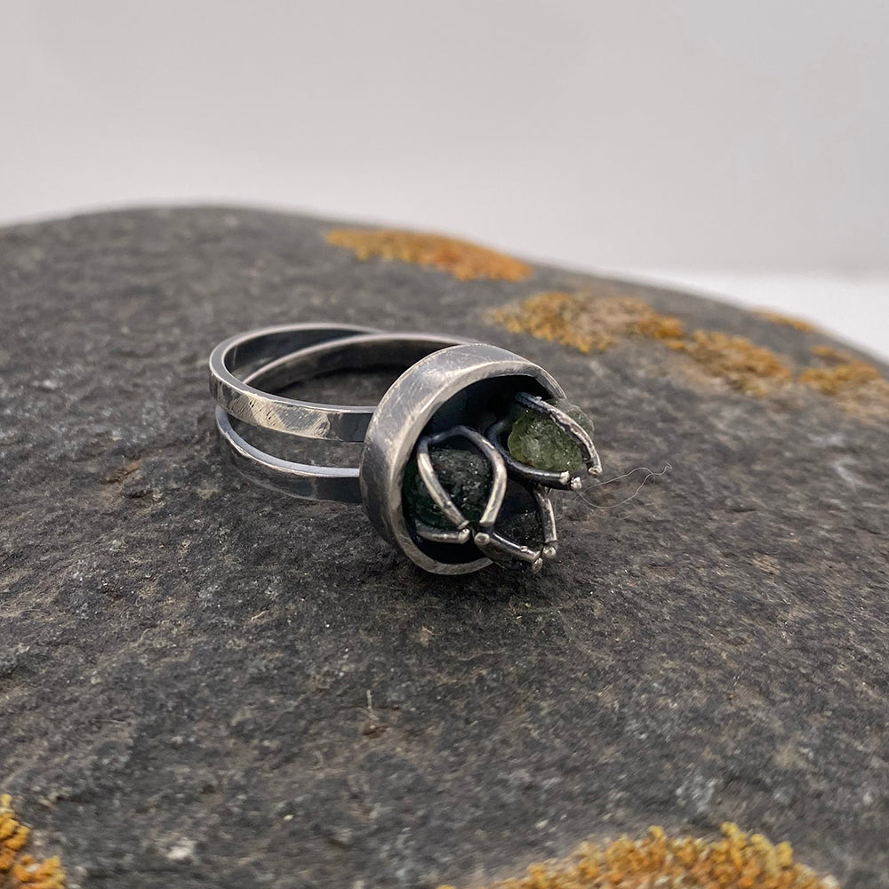 This ring is well-made, but not meant for rough wear. In other words, please take it off to do your gardening! Hand-crafted from recycled sterling silver and oxidized with a patina.