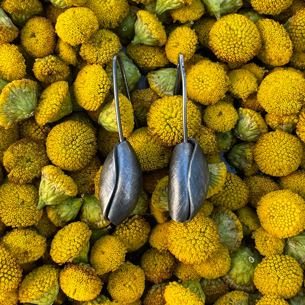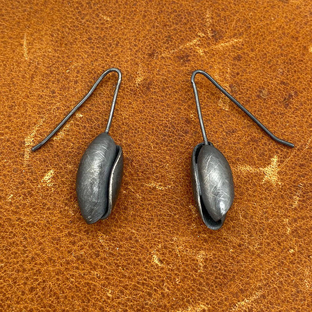 Recycled silver is forged into elliptical shapes and nested into a lovely unfurled flower. Oxidized with a patina and gently textured with an abrasive. The "bud" is about 3/4 inches tall, and the earrings dangle 1 1/4 inch from ear.