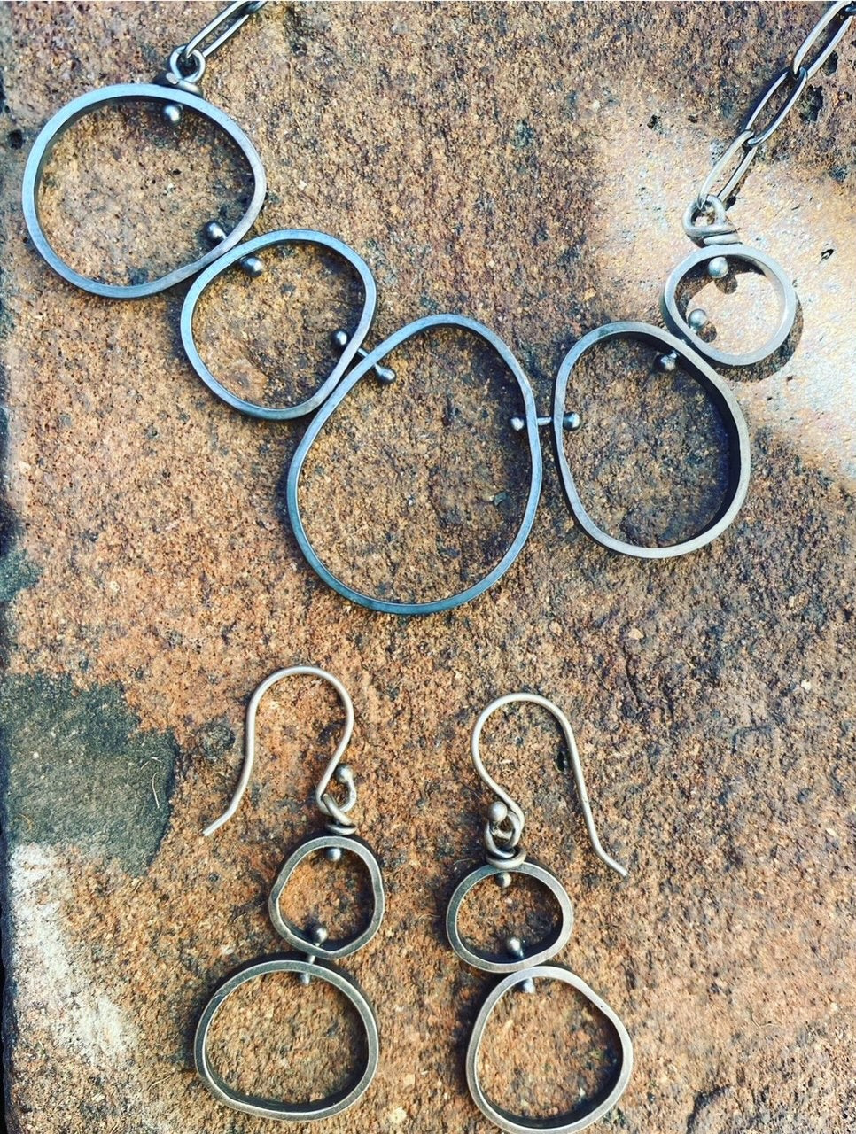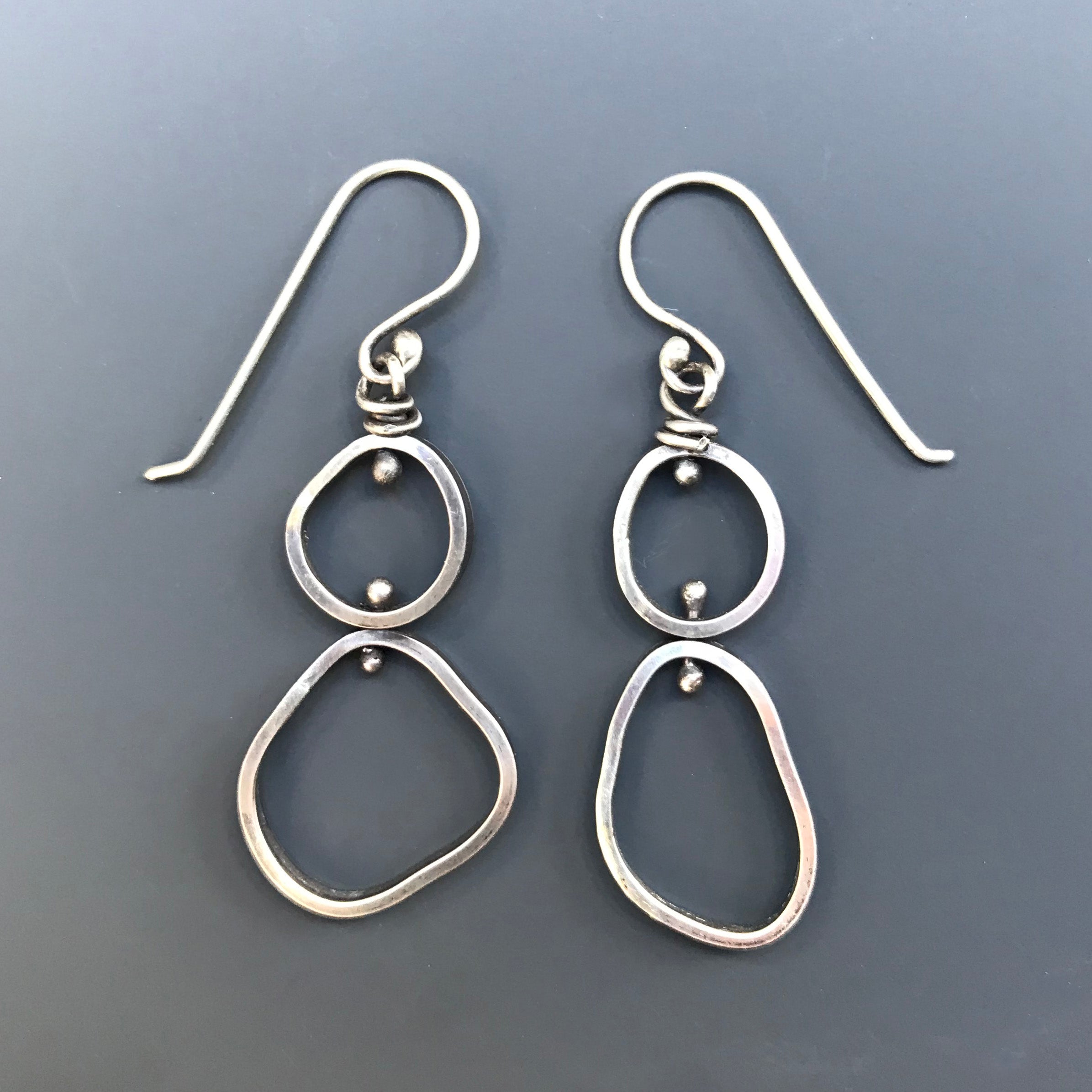 Contemporary earrings are recycled sterling silver wire formed to draw outlines of rocks. "Boulders" are attached by torch-drawn silver balls.