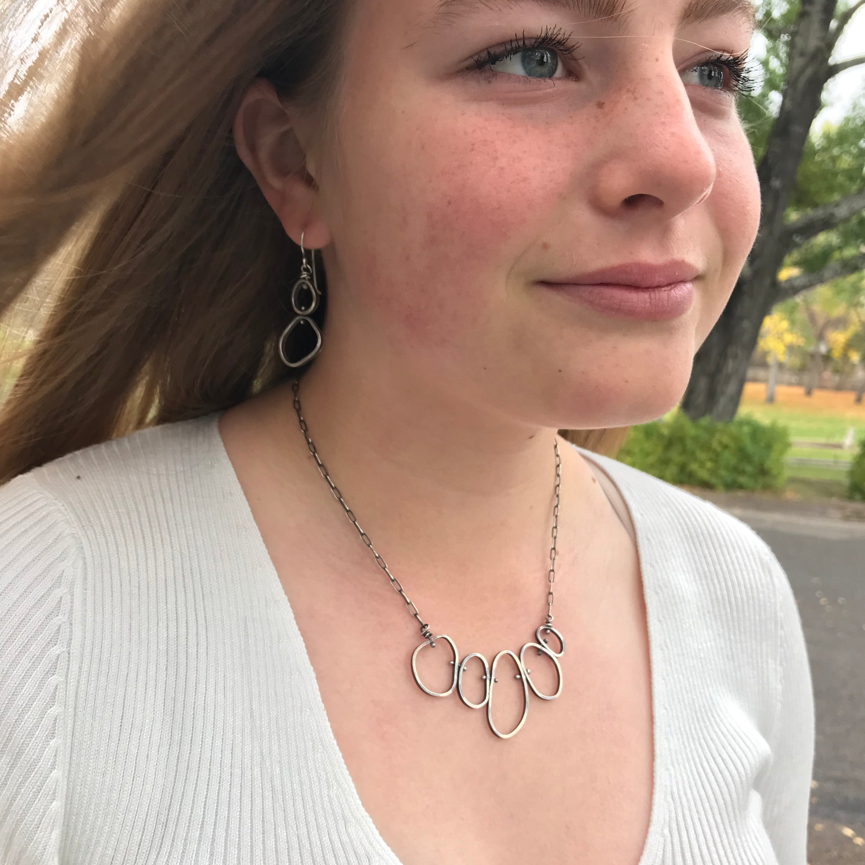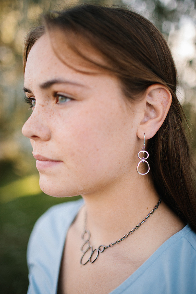 Silver is oxidized with a patina and polished on tops and backs, with the sides left dark to create contrast.