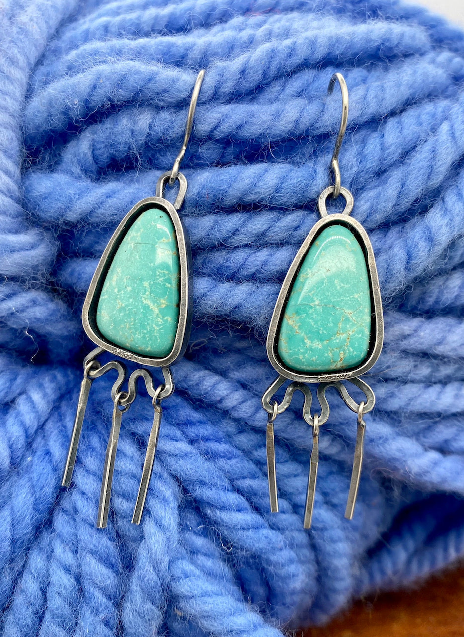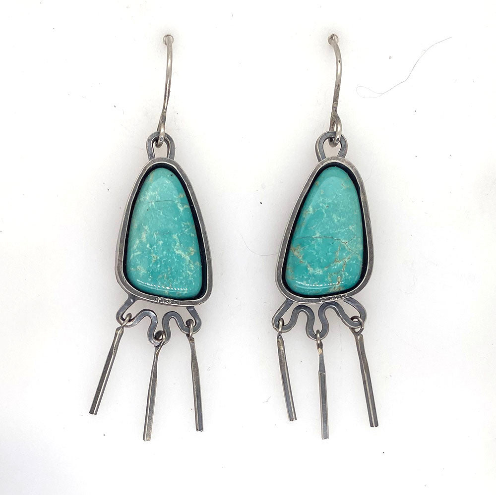 Like Chloe, these earrings sparkle with a playful character. Carico Lake Turquoise shines from within a whimsical sterling silver setting, complete with funky curves and swaying dangles.
