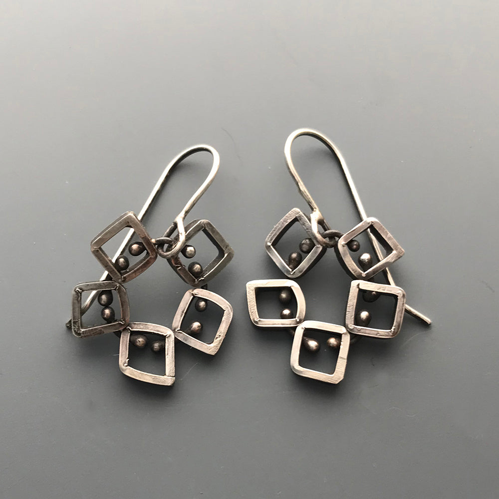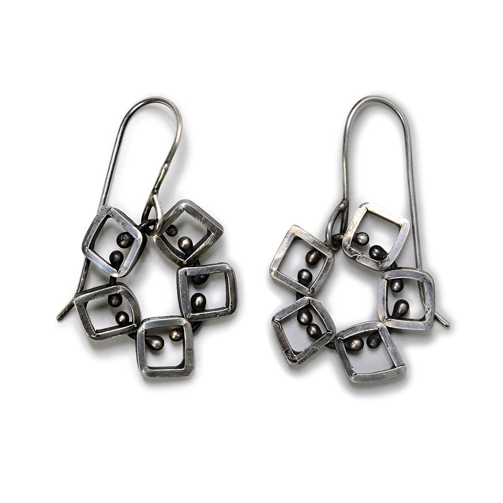 Handcrafted from recycled sterling silver and connected by balled silver wire, five small squares make up a clever take on round dangle earrings.