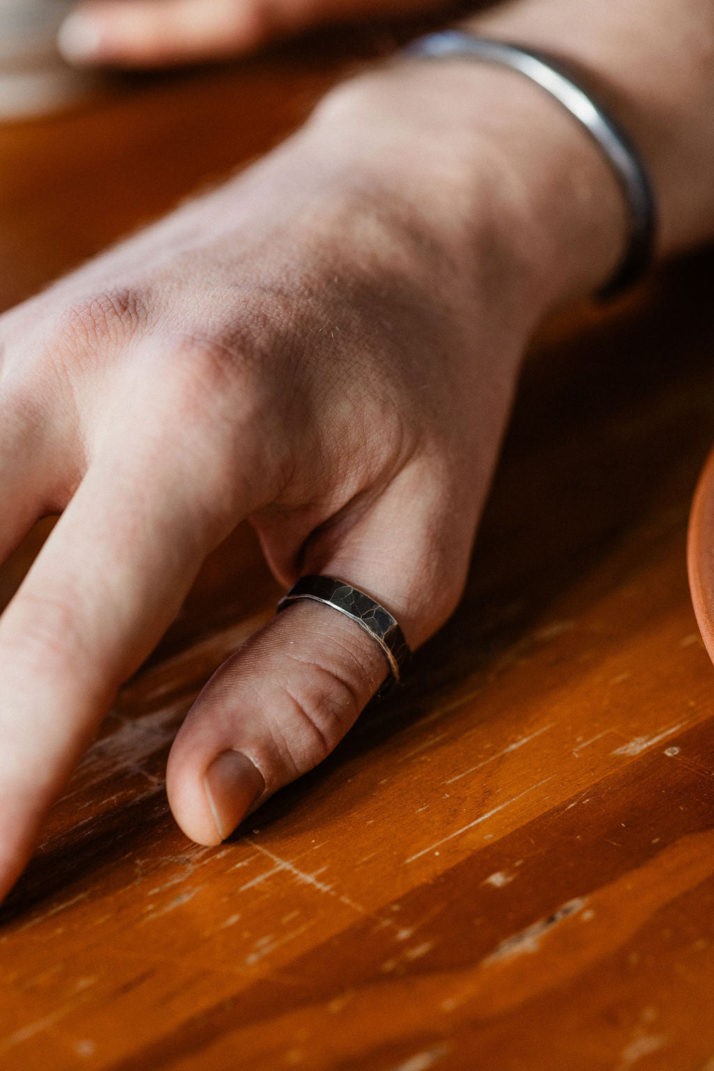 Sleek and comfortable with the charm of visible hammer marks. Simple band ring is easy to wear with a smooth profile. Makes a great thumb ring for women or an attractive band for men. Great for stacking.
