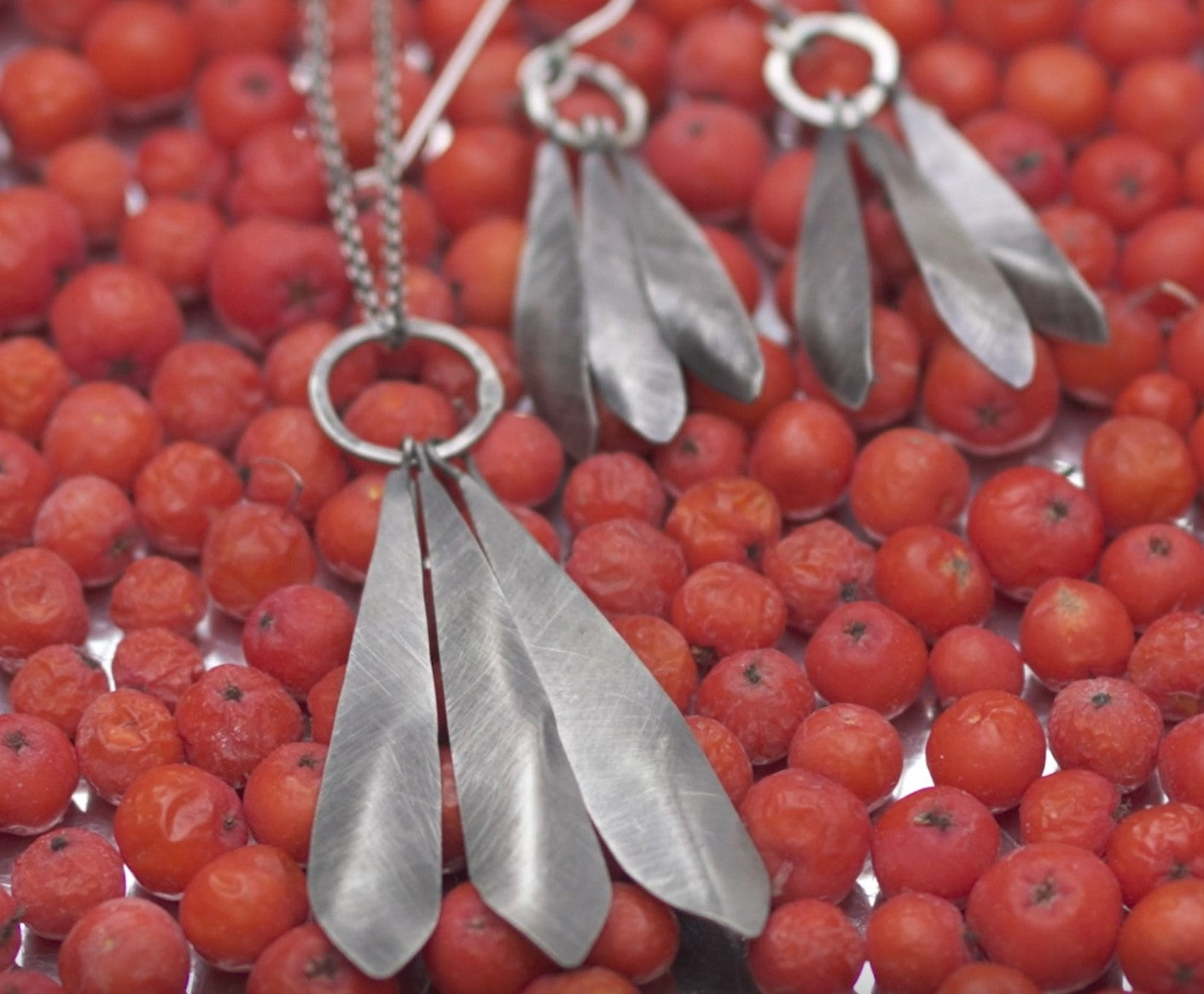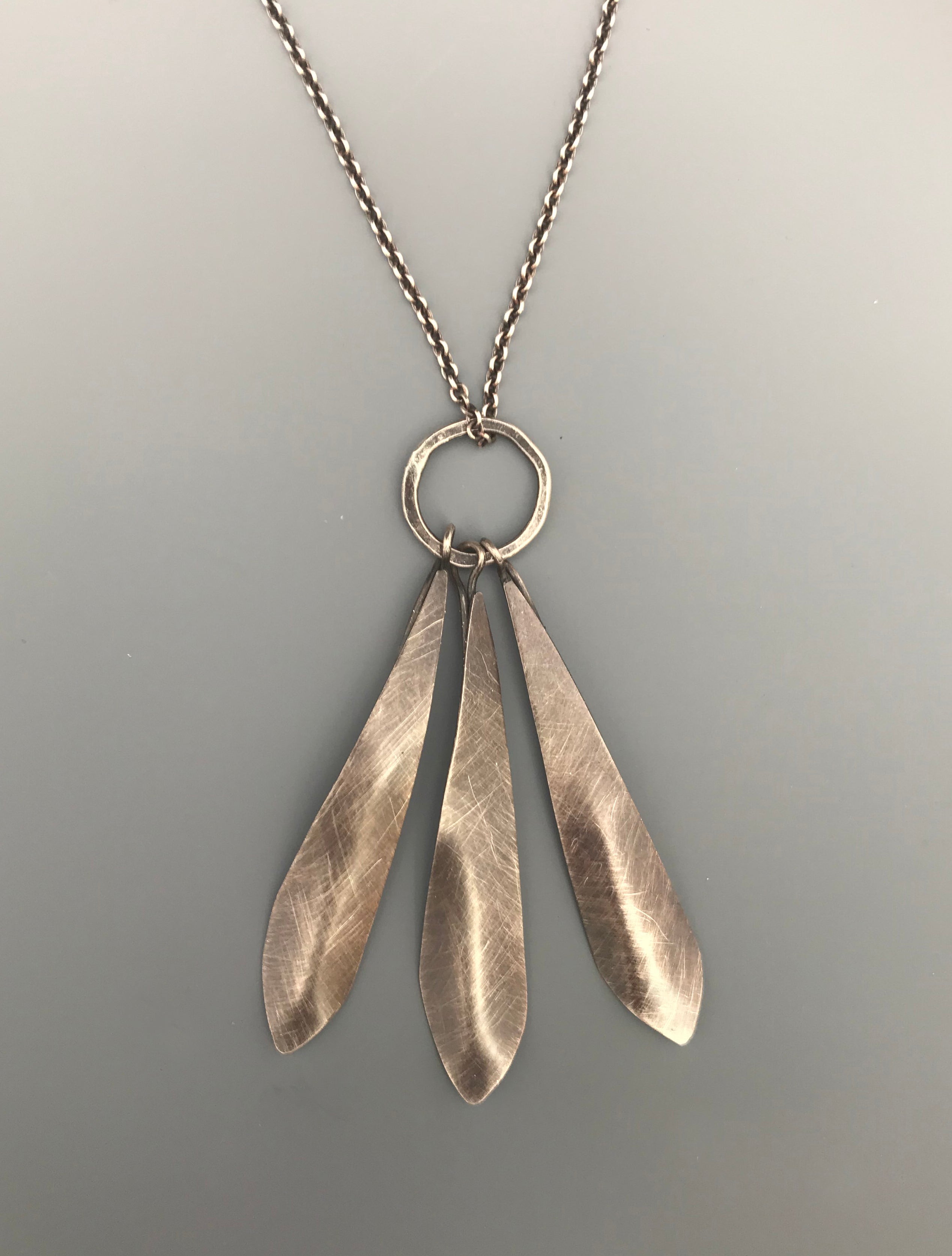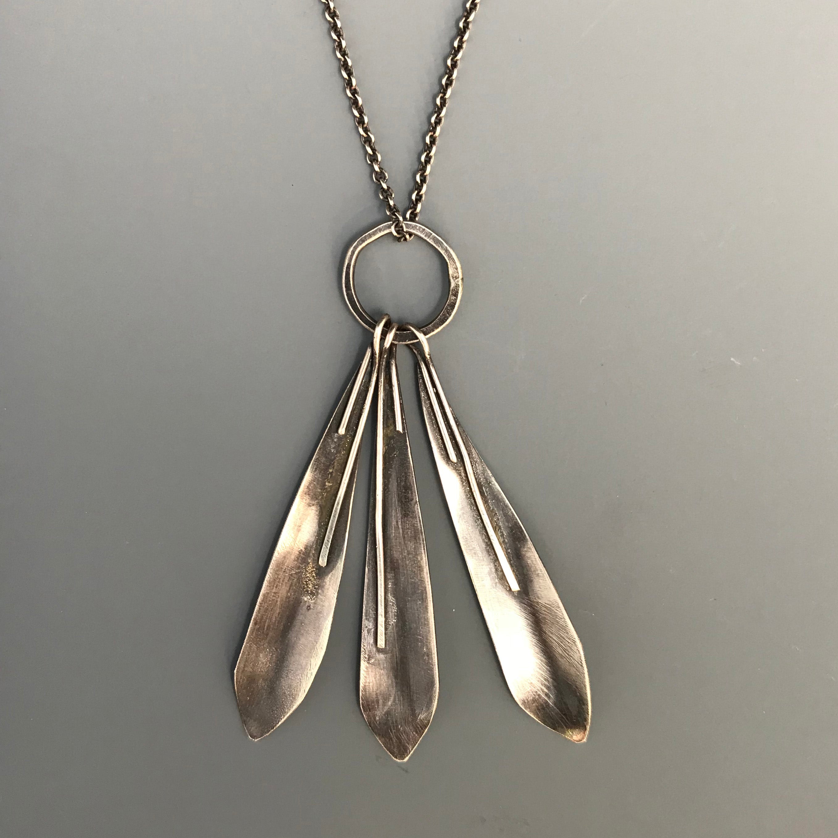 Three "feathers" or "petals" descend gracefully from a forged ring of sterling silver. Each petal has a subtly curved shape and a sophisticated brush-finish.