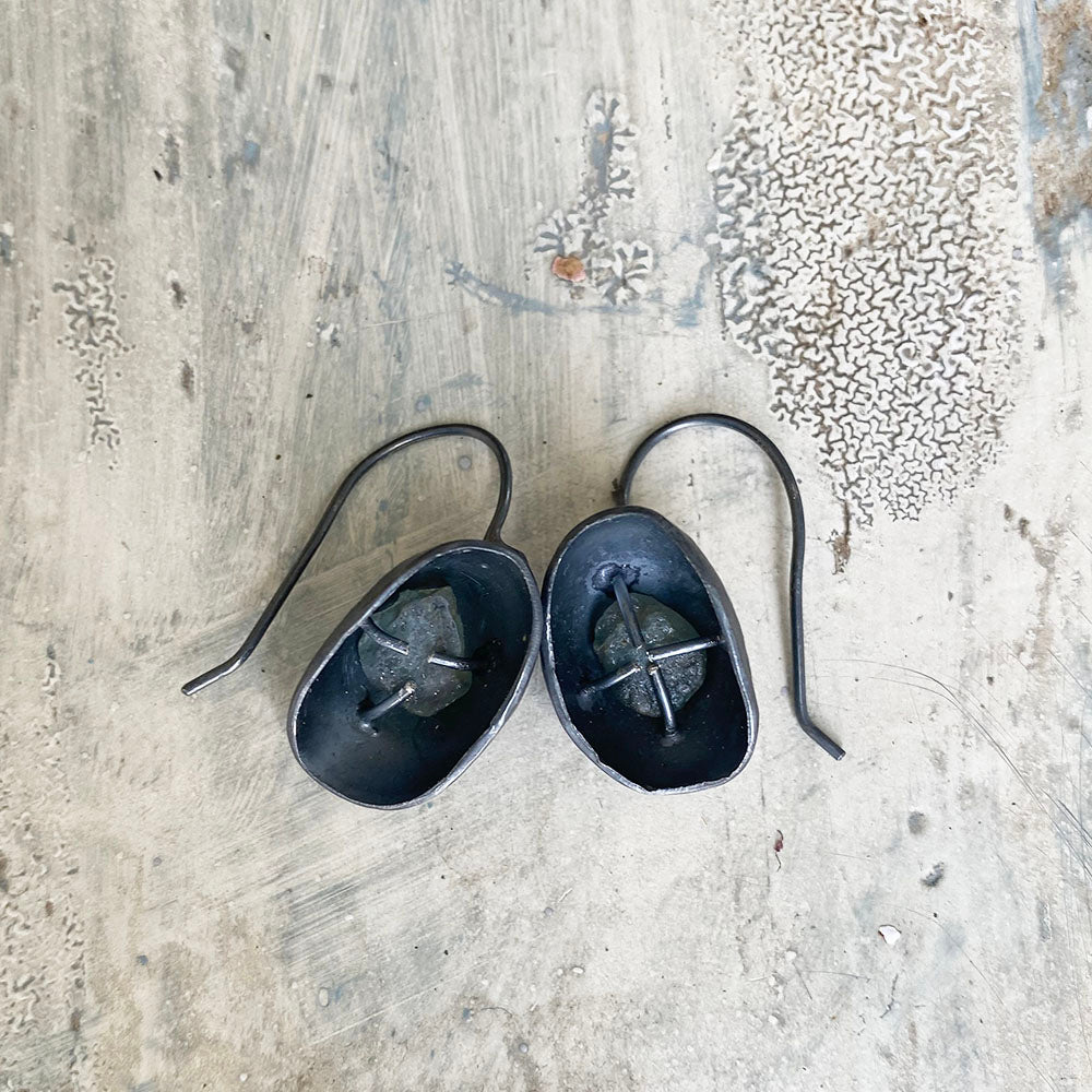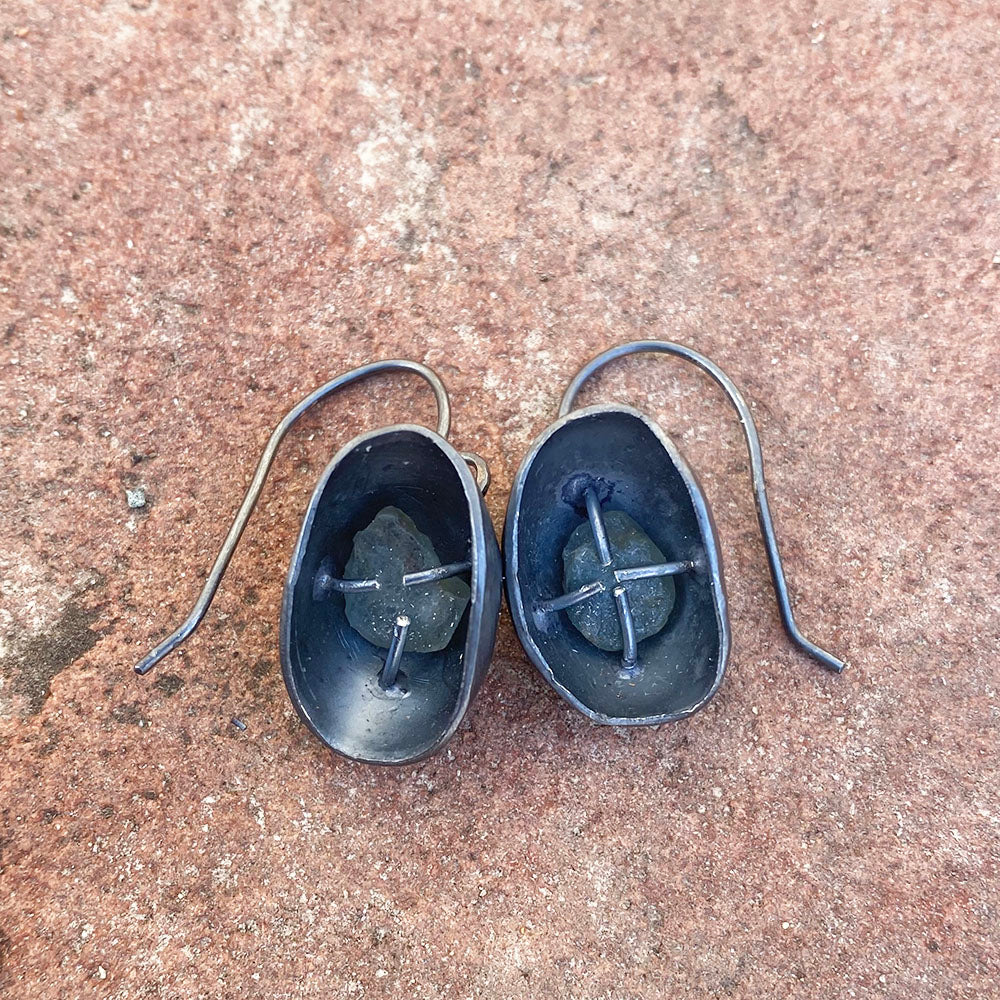 Uncut Montana sapphire slices are nestled into sculptural sterling ellipses in these rough-luxe earrings.