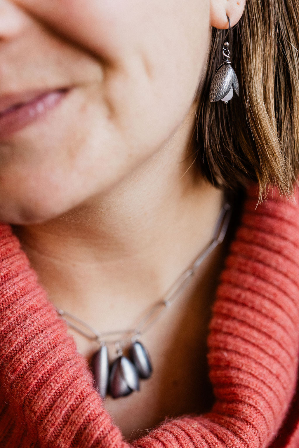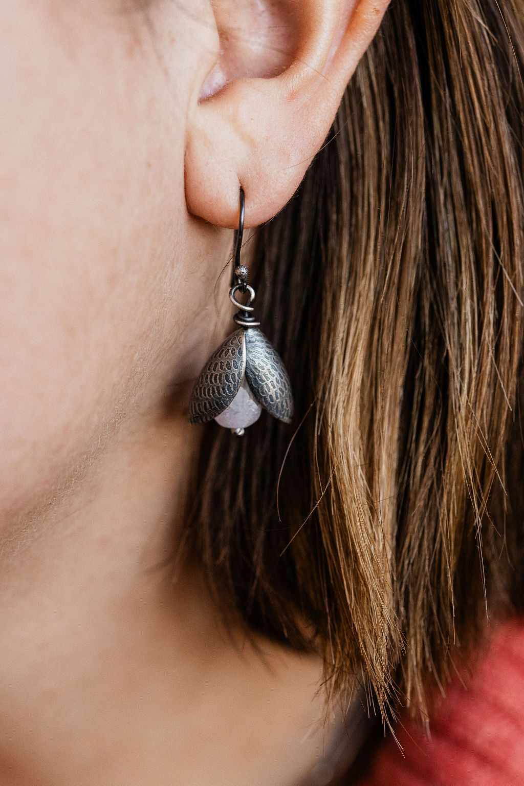 Sterling silver petals are intricately textured with a custom-etched design.