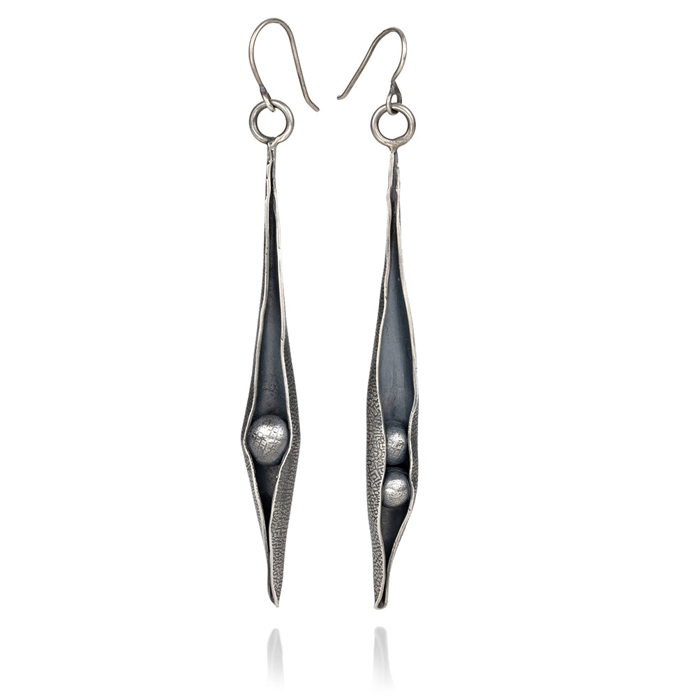 Sterling silver is textured with custom-etched patterns and forged into distinctive elegant pods holding hollow forged spheres.