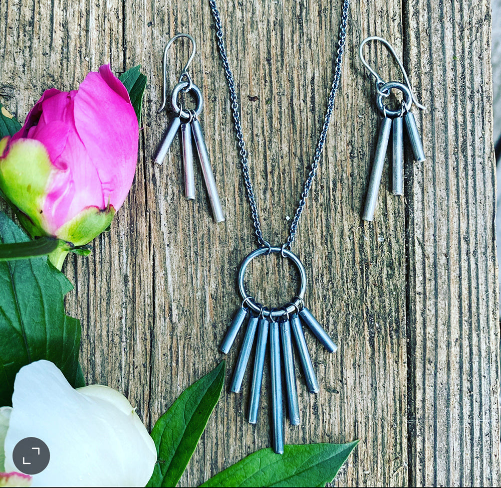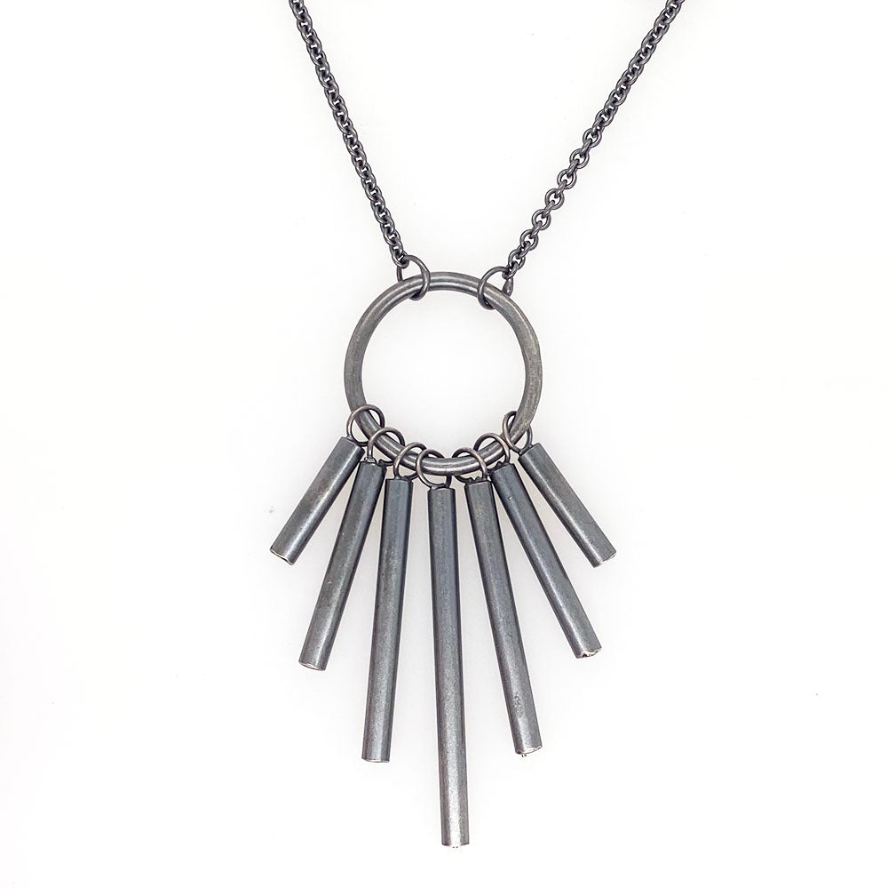 Oxidized sterling silver. The pendant is 2 inches long. Chain is 16 inches with.a 2 inch extension so that you can clasp the necklace at the perfect length for your neckline.