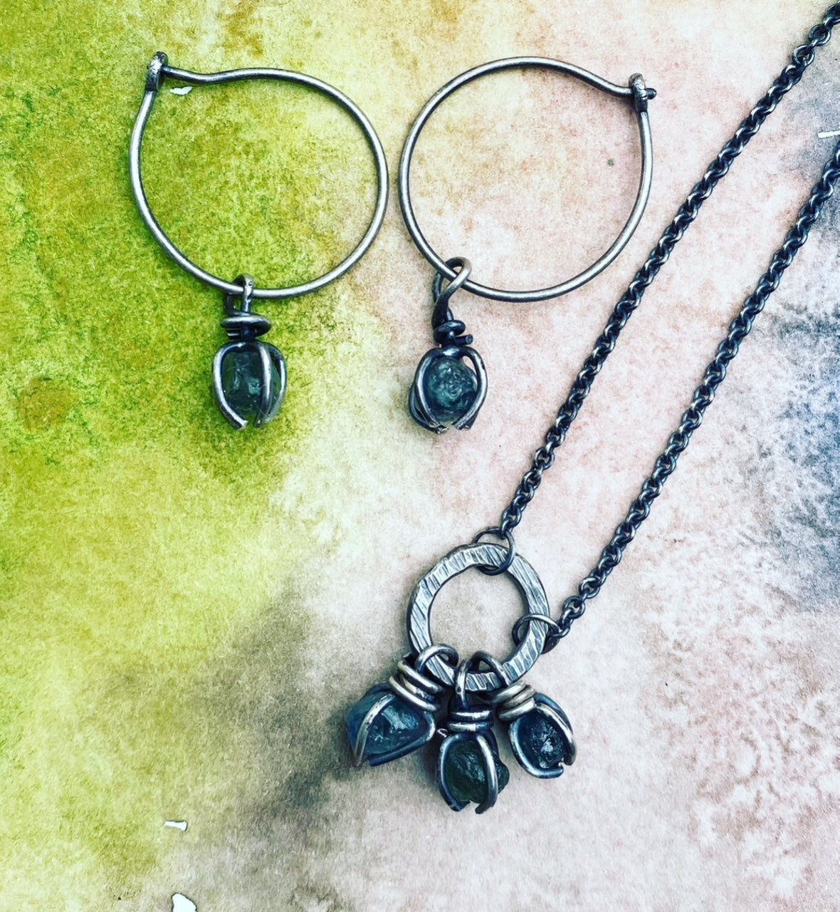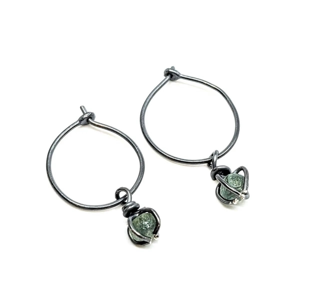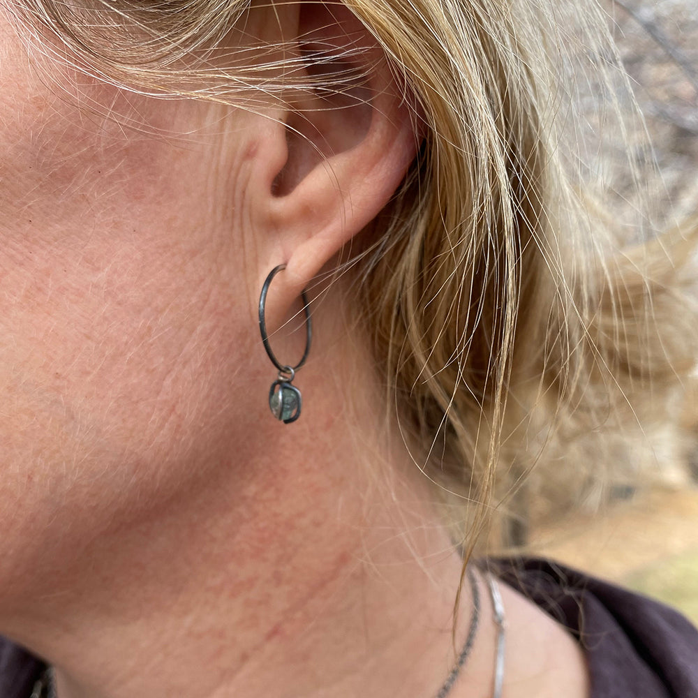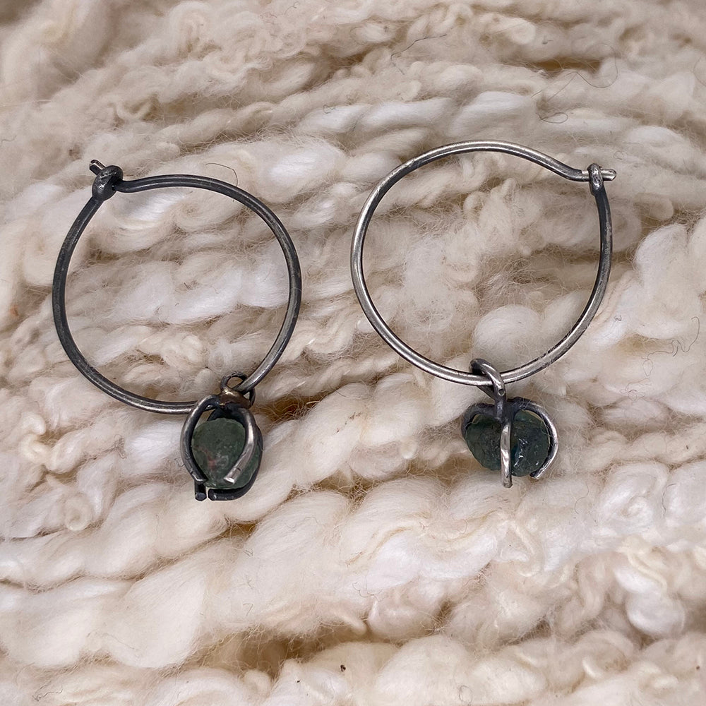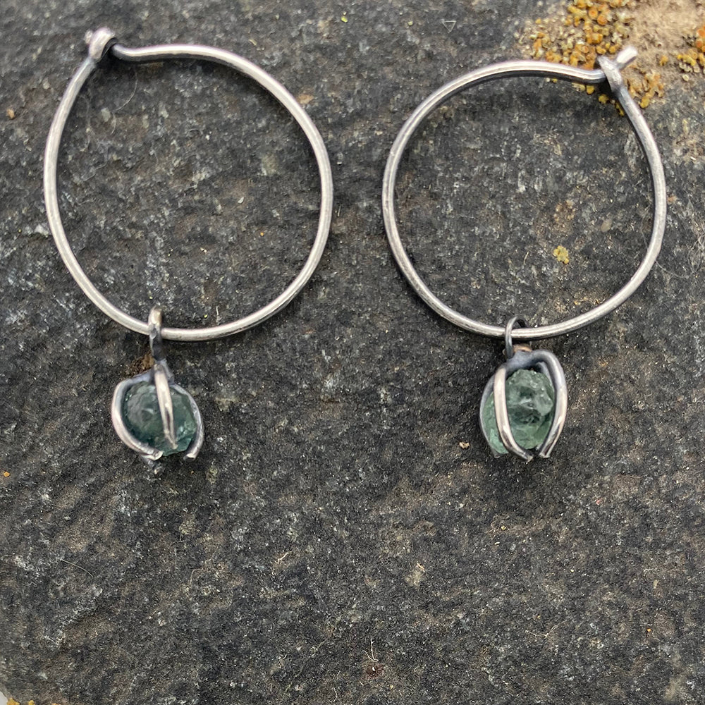 Rough Montana sapphires are cupped by hand-crafted sterling silver settings and dangle from simple, classic hoops.