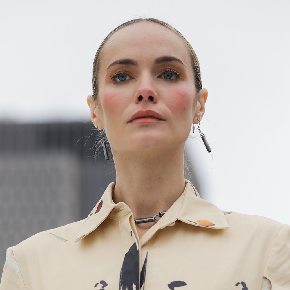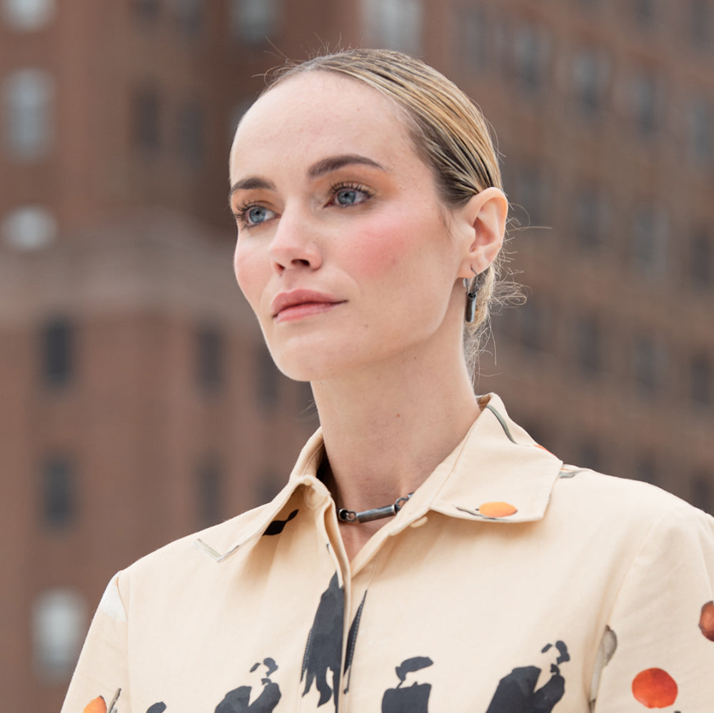 Recycled sterling silver is milled to produce compelling textures, and hammered into cylinders. Hand-forged sterling disks link the "noodles".