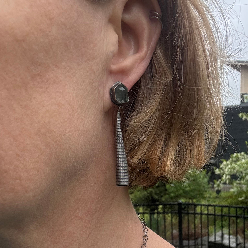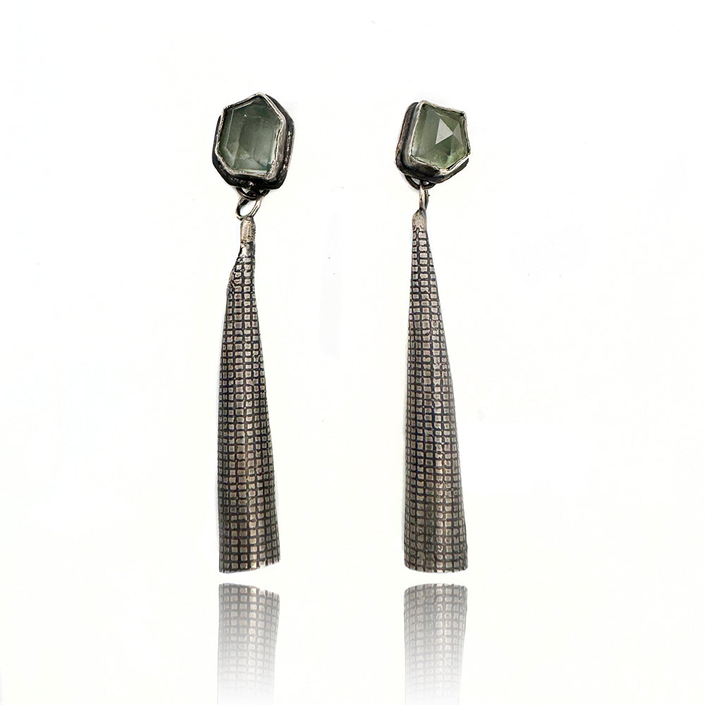 Hand-fabricated from recycled sterling silver and faceted aquamarine stones sourced from a small family lapidary. The silver cones have a subtle stippled texture.