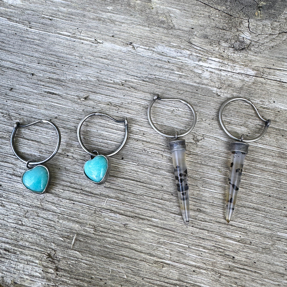 Sterling silver caps and hoops are oxidized with a patina and lightly polished to a warm, matte finish.