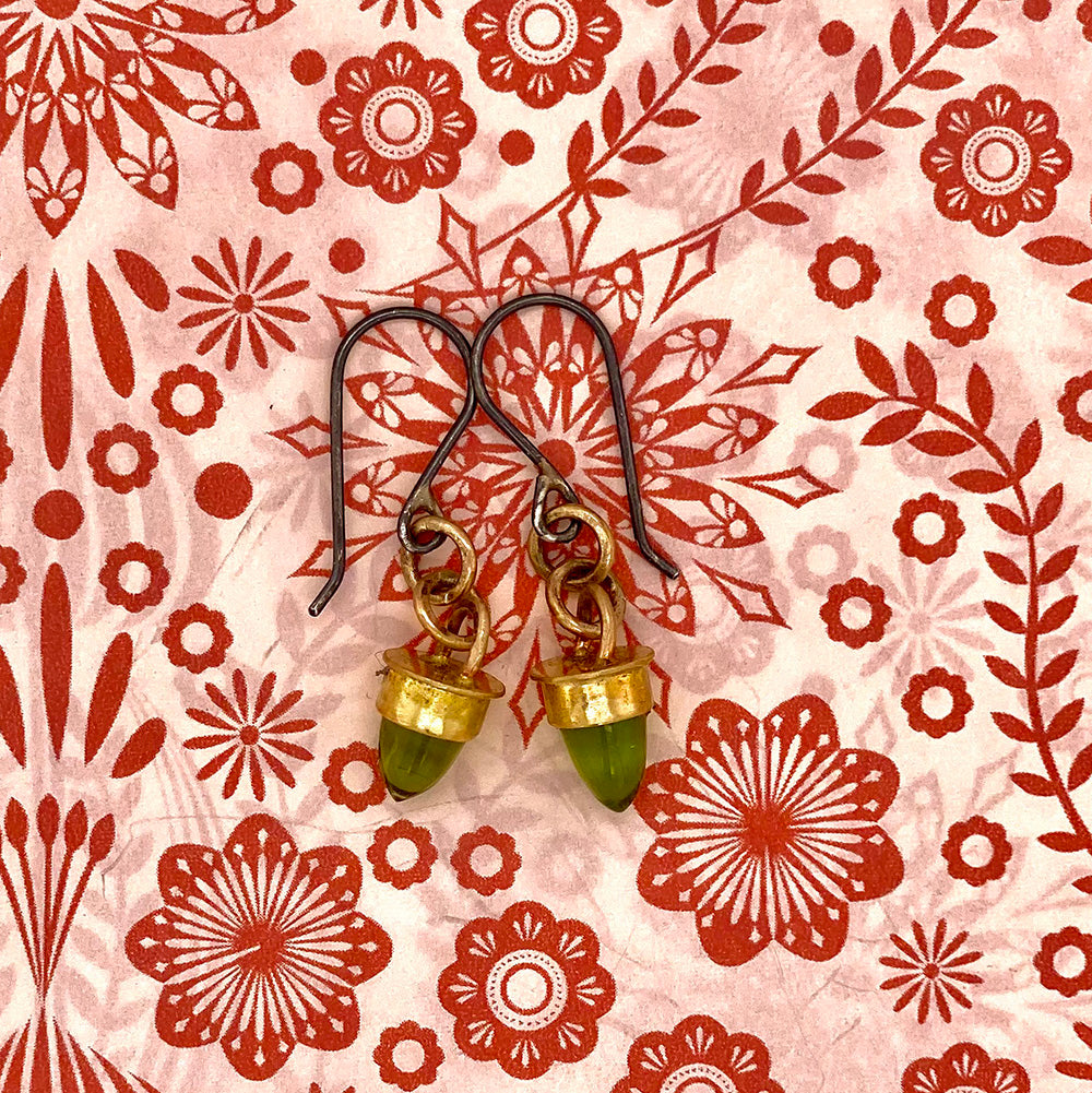 Hand-cut peridot bullets and hand-fabricated gold settings.