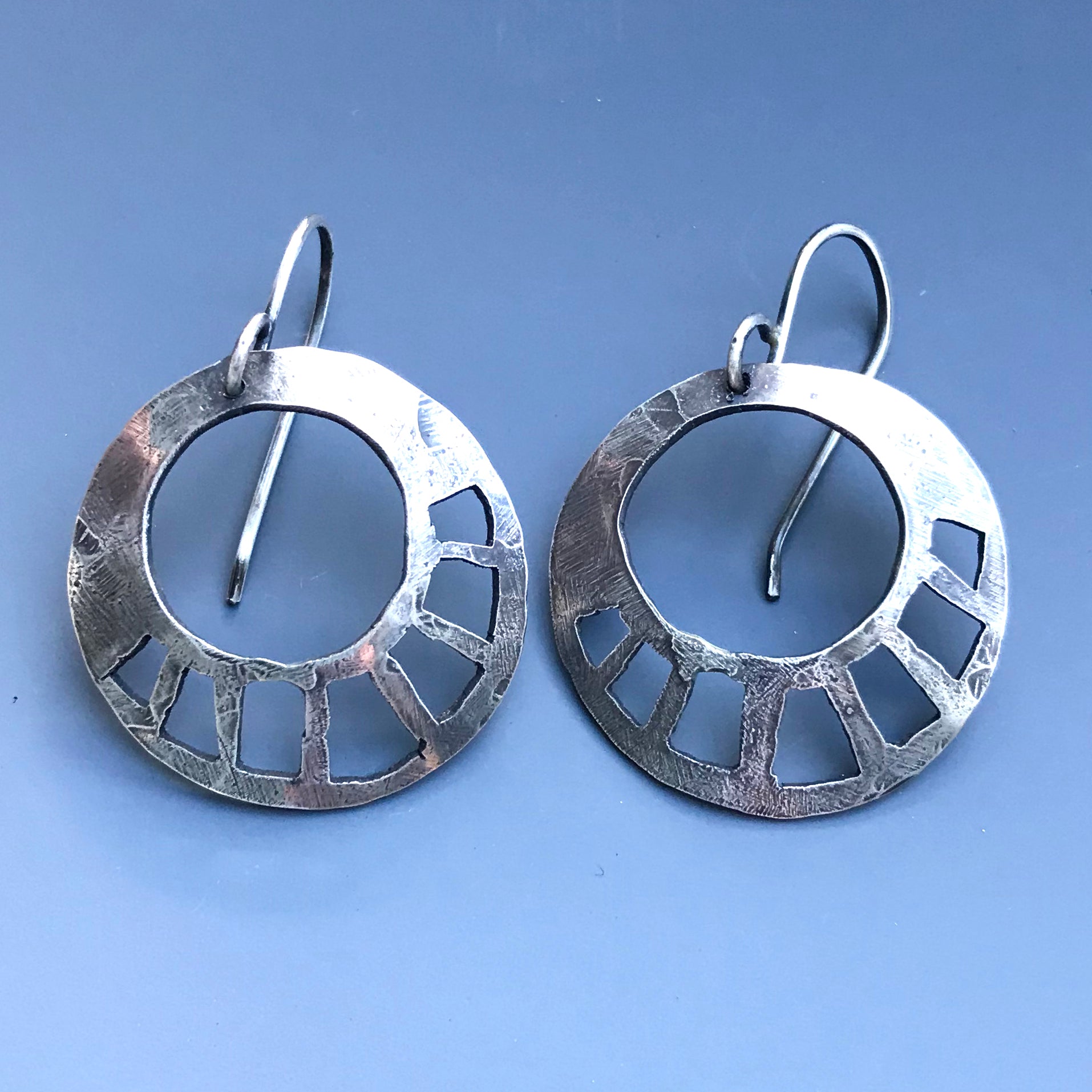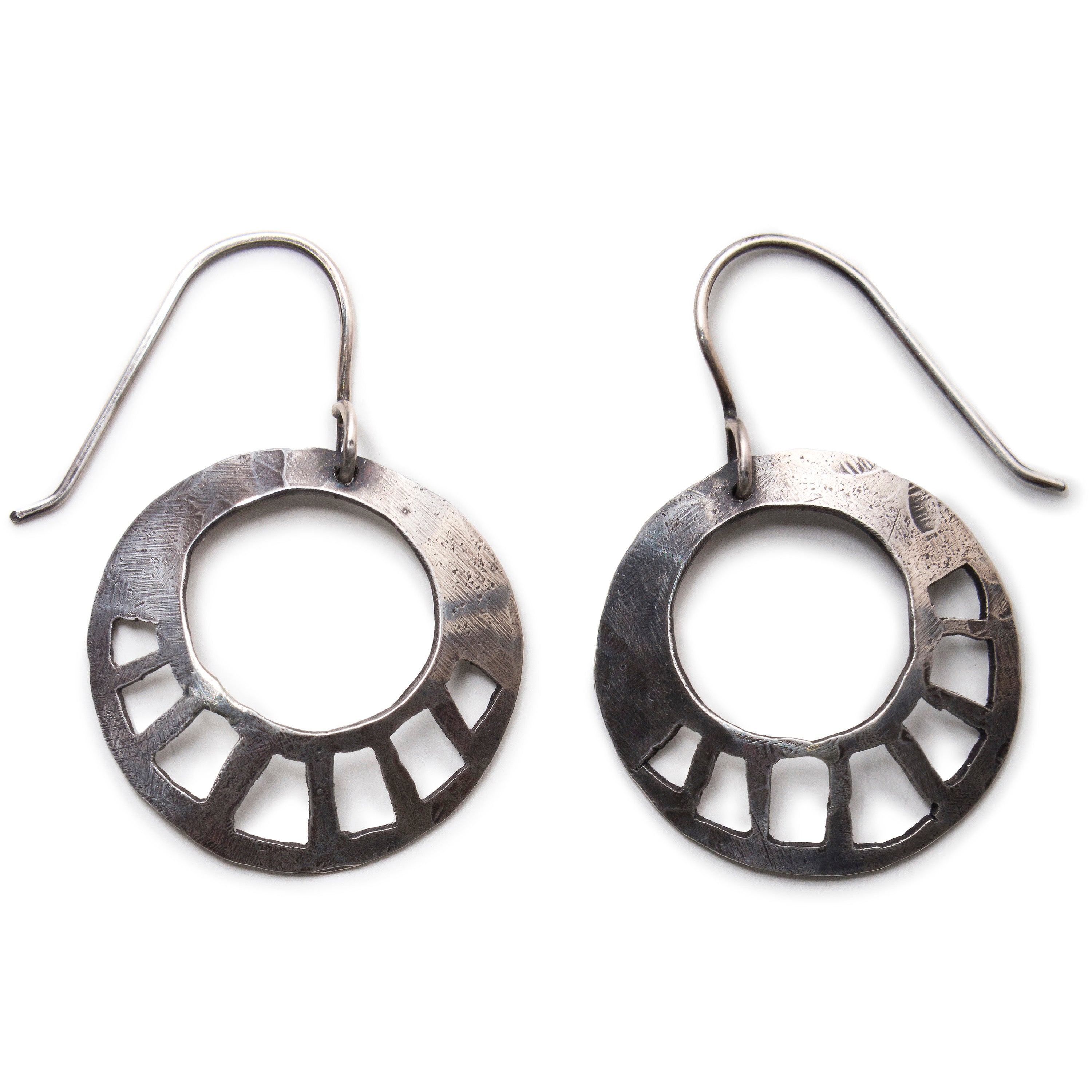 Entirely handcrafted from recycled sterling silver sheet and wire. Each opening carefully sawed out and filed. Hammered for texture and gently curved for volume. Treated with a patina to highlight the hammer marks and give a lovely sheen to the silver.
