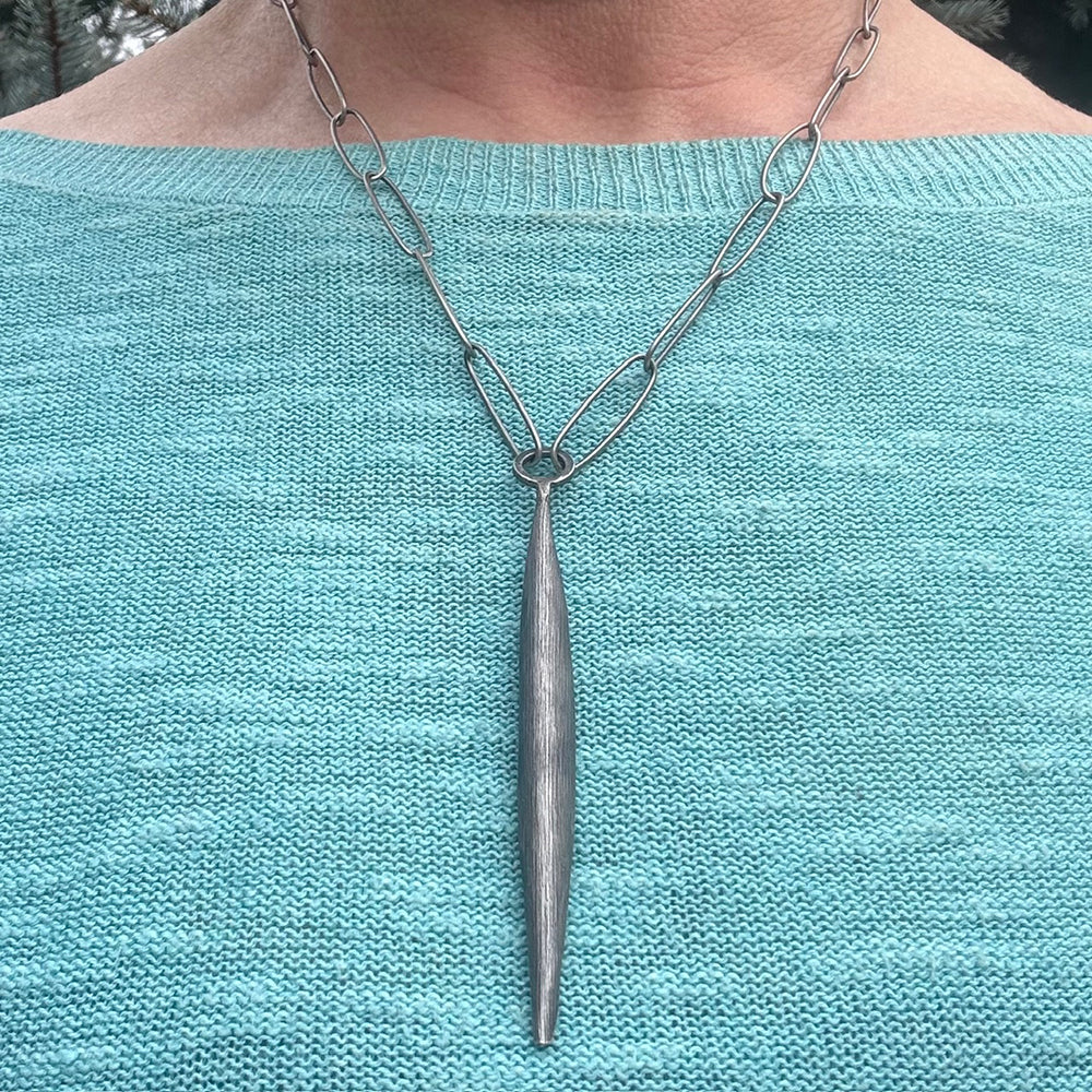 Hand-fabricated sterling silver chain is 17 inches with a 2 inch extension, so that you can clasp it at the perfect length for your neckline. Can be made longer for an additional cost.
