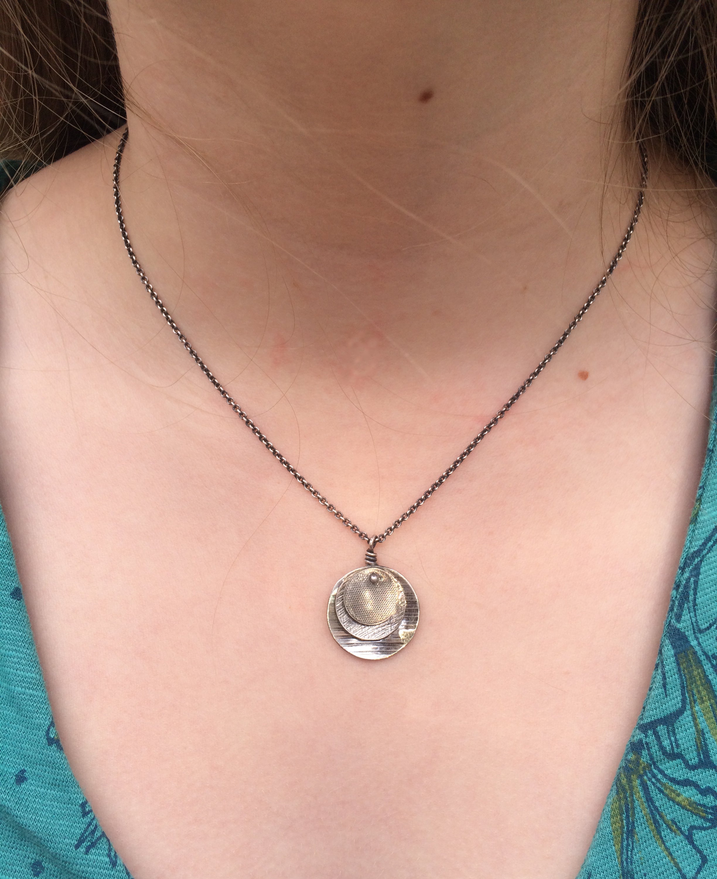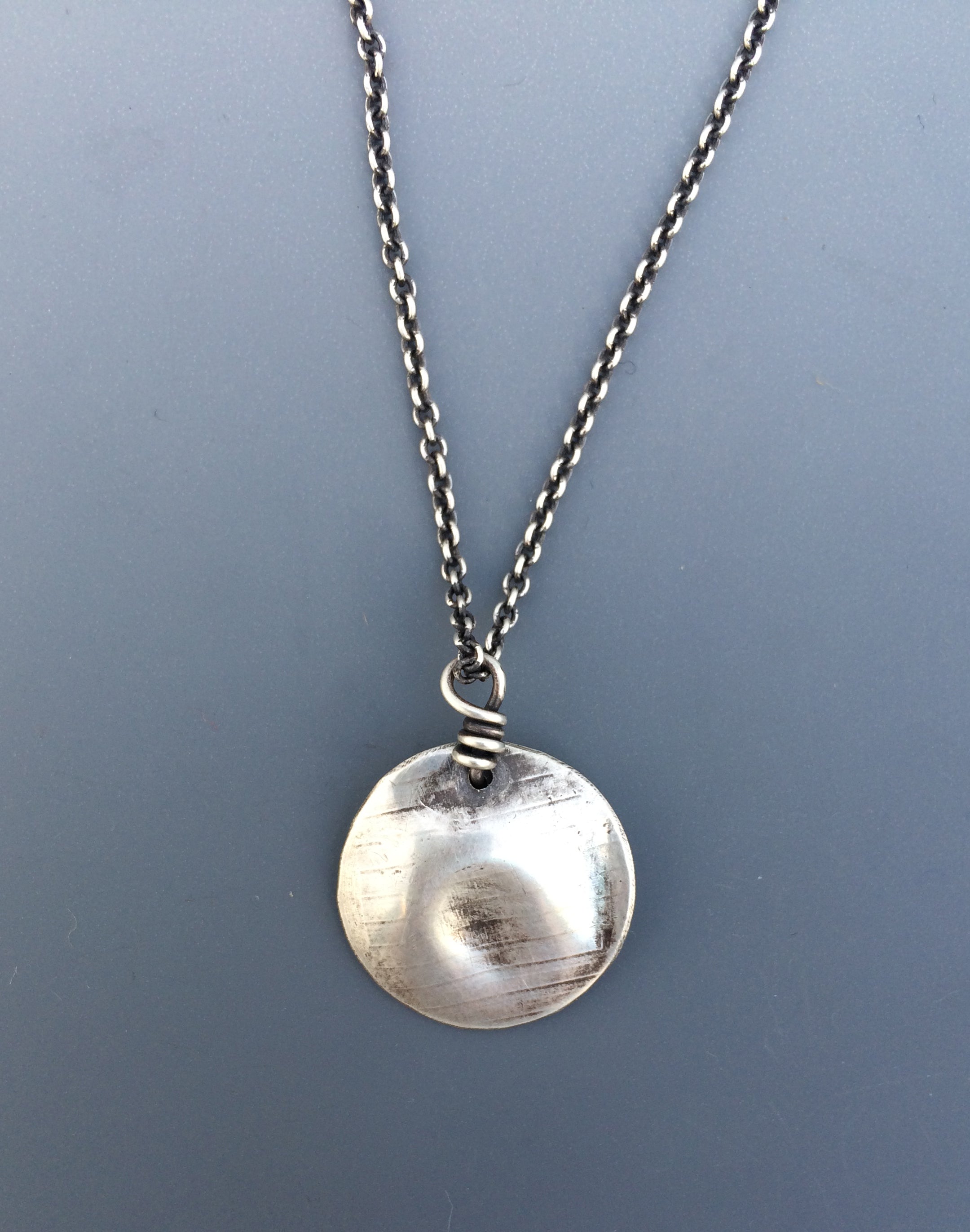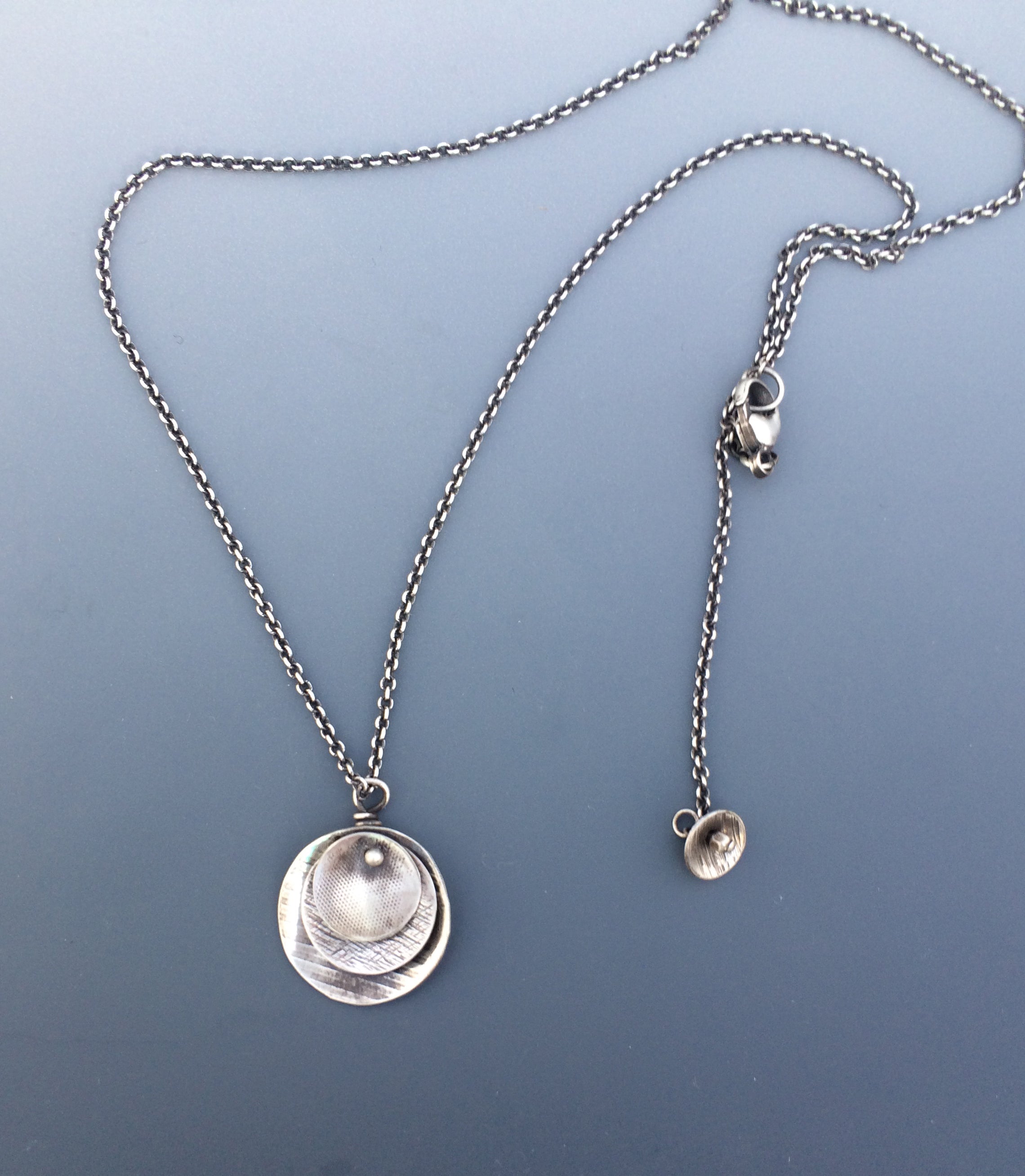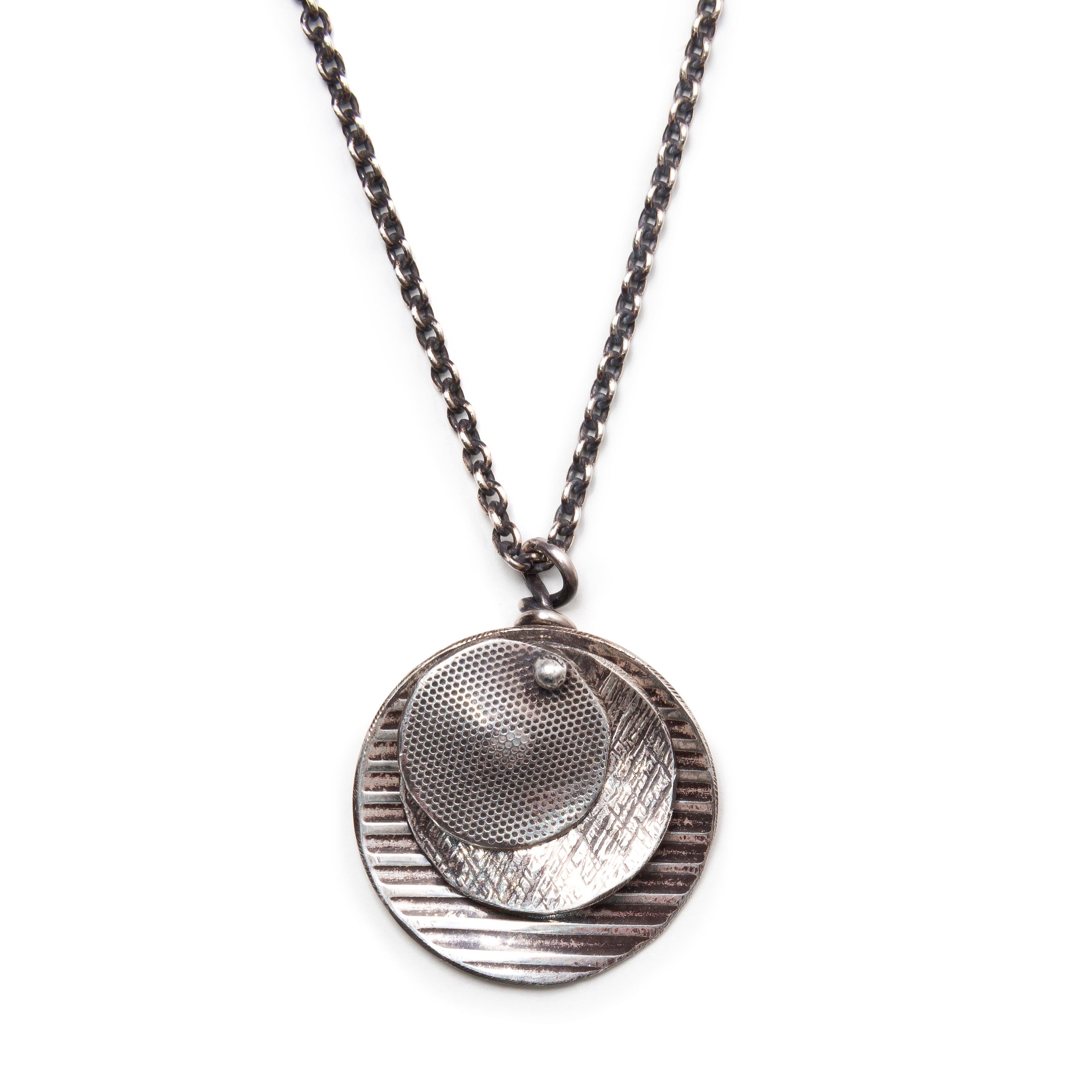 Sterling silver disks with contemporary textures are gently warped and stacked.