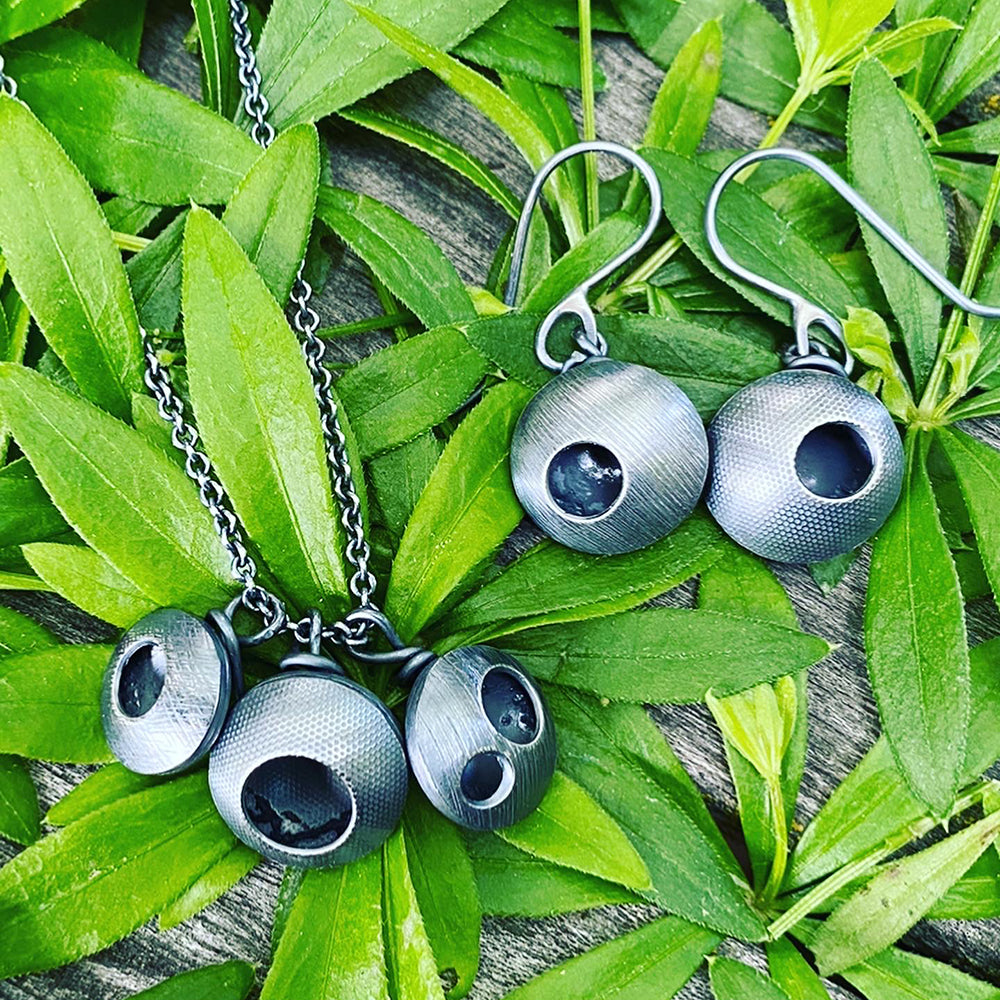 Silver is oxidized with a patina to add a warm sheen to the silver and bring out the contrast of the textures and the depth of the hollow orbs.
