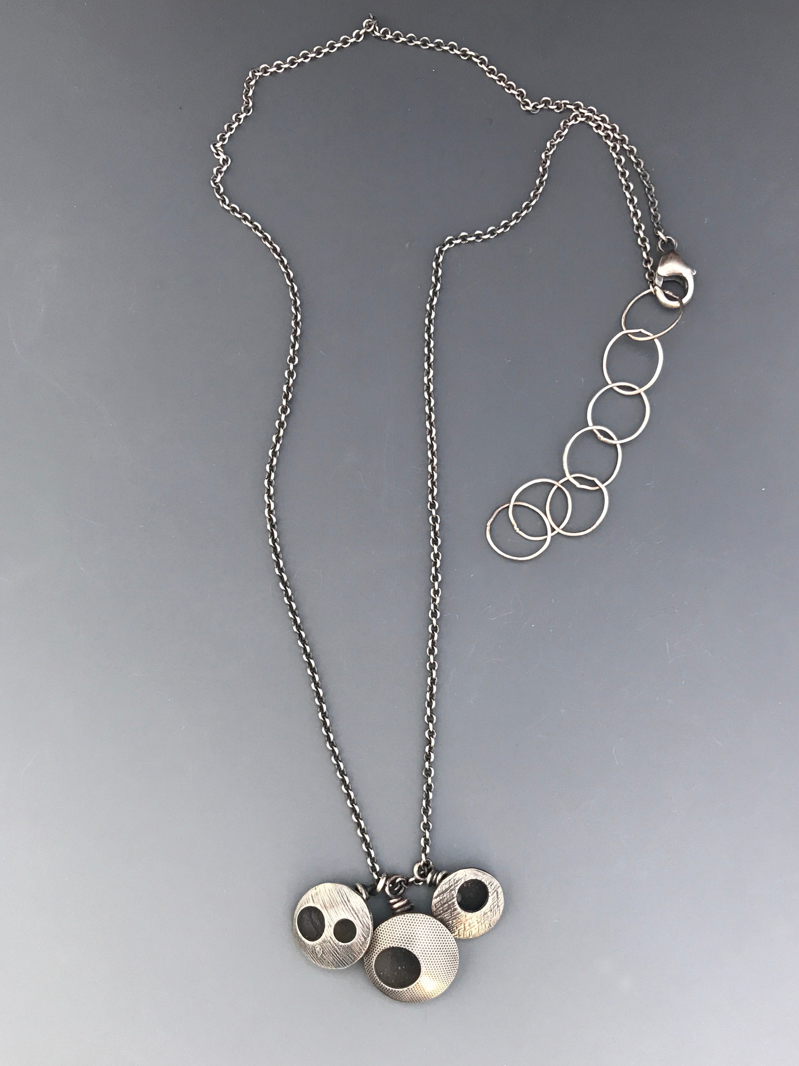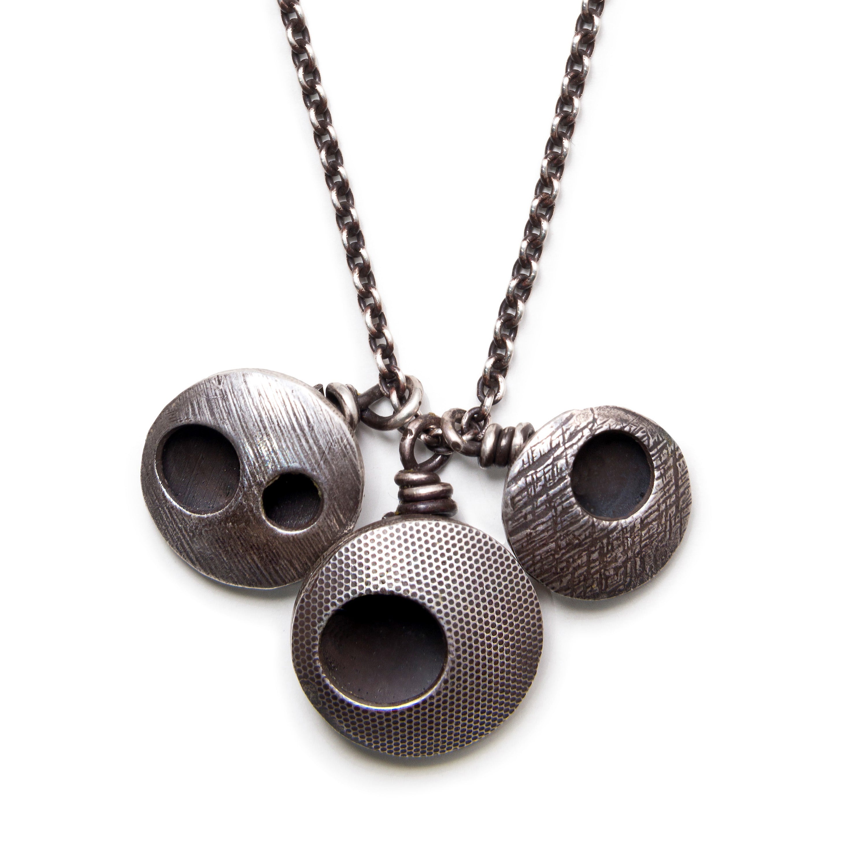 A necklace with loads of character! Three whimsical orbs dangle from a sterling silver chain. Orbs differ in size, texture, and smattering of holes.