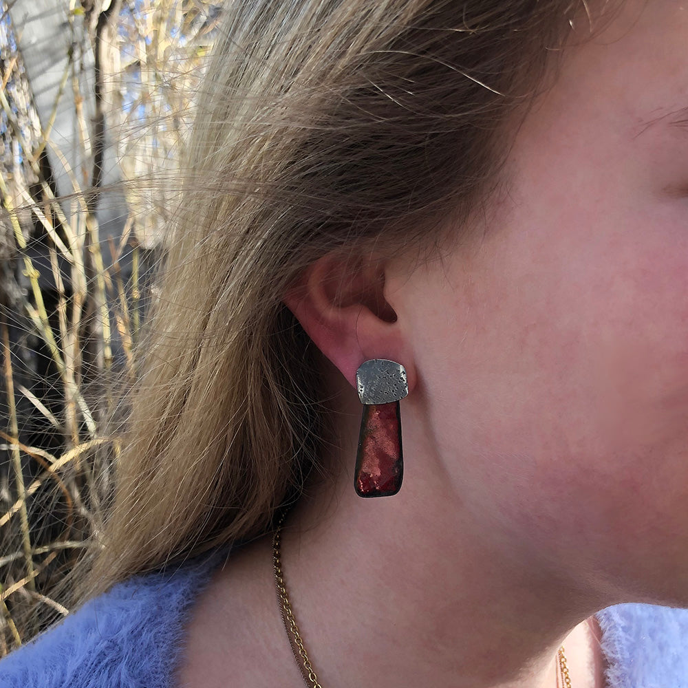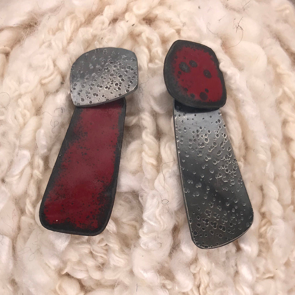 Constructed from recycled sterling silver and copper, textured with a hammer, and enameled in vibrant, playful colors.